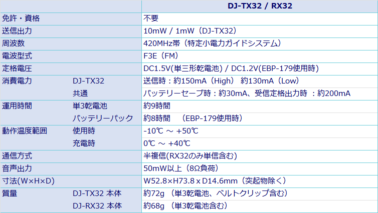 送信専用機:DJ-TX32、受信専用機:DJ-RX32は、従来製品(DJ-TX31/RX31)の改良版後継機です。